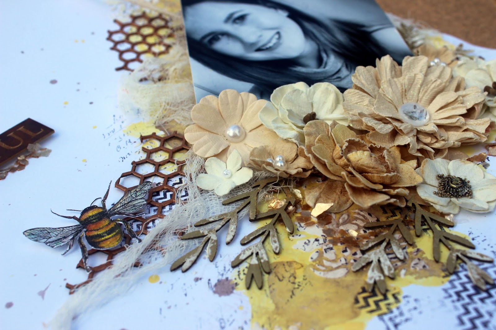 I then painted CB5122 Hexagon Mesh 01 with some metallic copper paint and tucked it under the photo and to the top left of the layout.